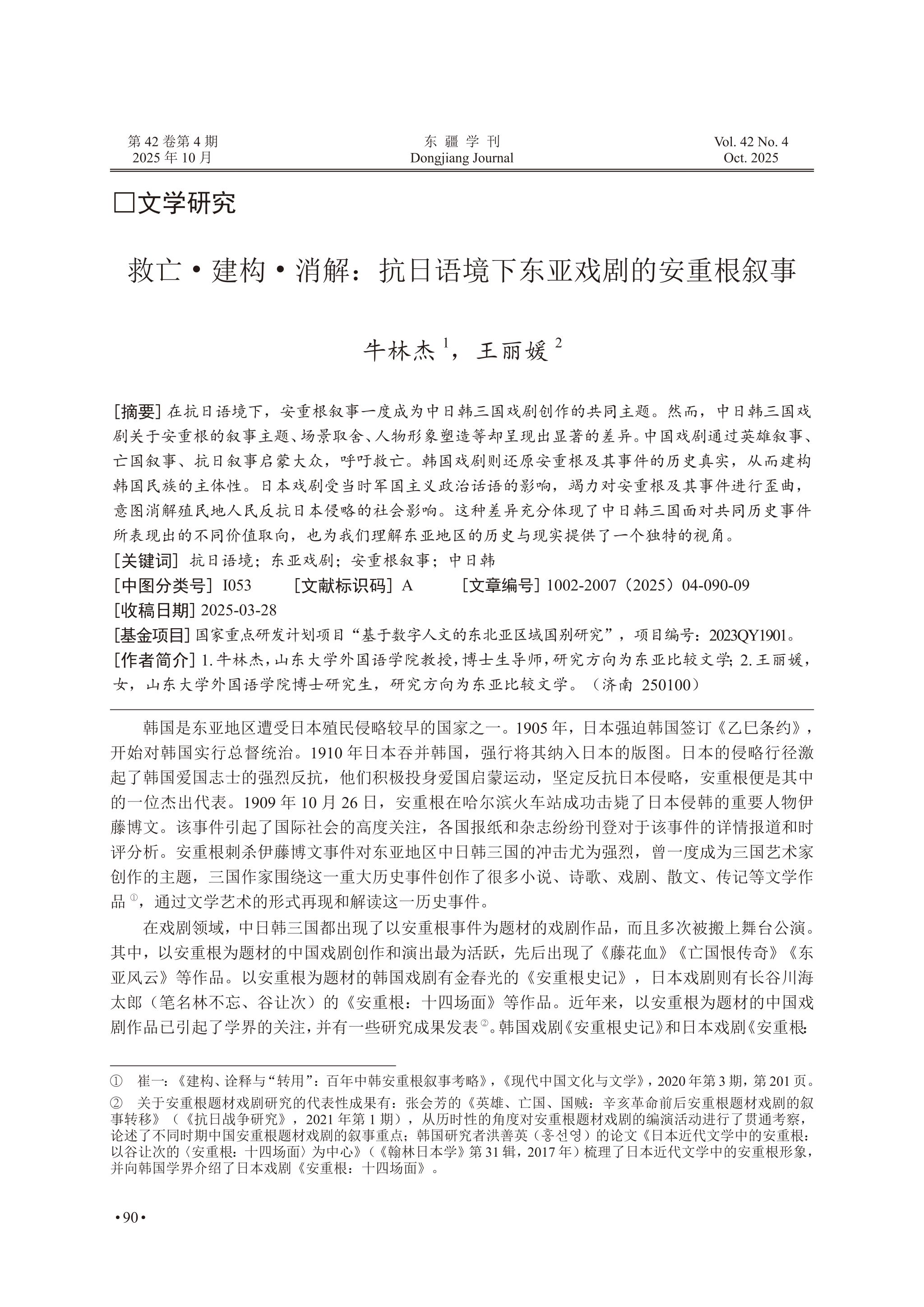 牛林杰、王丽媛:《救亡• 建构• 消解:抗日语境下东亚戏剧的安重根叙事》,《东疆学刊》,2025年第4期,第90-98页。